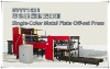 Single-color metal printing machine is suitable for industries of metal printing and tins making. Main technical Performance Imported bush bearing with pre-stress is selected for plate cylinder, rubber cylinder and impression cylinder.Rubber cylinder and impression cylinder with single eccentric separately and air cylinder solenoid for coupling.Ink forme roller with air cylinder solenoid for coupling..Water forme roller with air cylinder solenoid for coupling. The speed of water duct roller can be adjusted separately. Its speed is synchronized with main motor.Up and down of the delivery table is driven by air cylinder.Inside and outside pushers are used in addition to belt conveyor to avoid scratch on backside of sheet.The surface of the rubber cylinder and impression cylinder are coated for corrosion-proof. The surface of the impression roller is specially treated for greater hardness and abrasion-proof.Stainless steel is used for water duct roller and damping vibrator roller, otherwise they are treated for rust-proof.Imported PLC and frequency converter are used.10. The coupling of cylinder and the lift of delivery table are opto-electrically controlled. 11. Imported double sheet detector is used. 12. Plate cylinder, ink forme roller, water forme roller can be clutched on/off separately, or controlled by PLC. 13. Speed and gap adjustment between impression and rubber rollers (DRO) and safety device are all on man-machine interface controlled by PLC. 14. New lubrication style is provided (3 kind of preset) 15. High place teeth-gripping cam construction is used. 16. Sheet separation and transfer with electronic phase detection technique. Main Specification Max. size of metal plate 1070×900mmMin. size of metal plate 712×508mmThickness of metal plate 0.15-0.5mmMax. space of printing 1068×880mmSize of printing plate 1090×995×0.3mmSize of rubber plate 1090×1120×1.9mmBlank side width 6mmMax. Printing speed 5000 sheets/hrHeight of feeding line 916mmMax. Material feeding 1.5 tonPower of main motor 15KWCapacity of air pump 140 m3/hrDimension of press(L*W*H) 8950×3310×2300mm